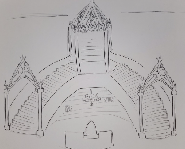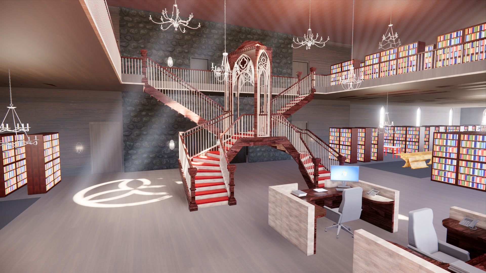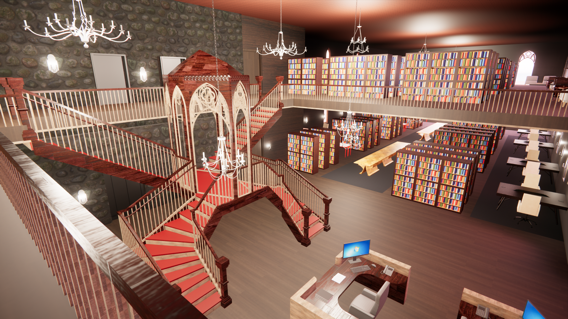 This library is modern but has touches of gothic architecture and designs. The overall feel of the space is moody, sophisticated and eclectic. This castle like lobby will entice people to study in a mystical atmosphere.